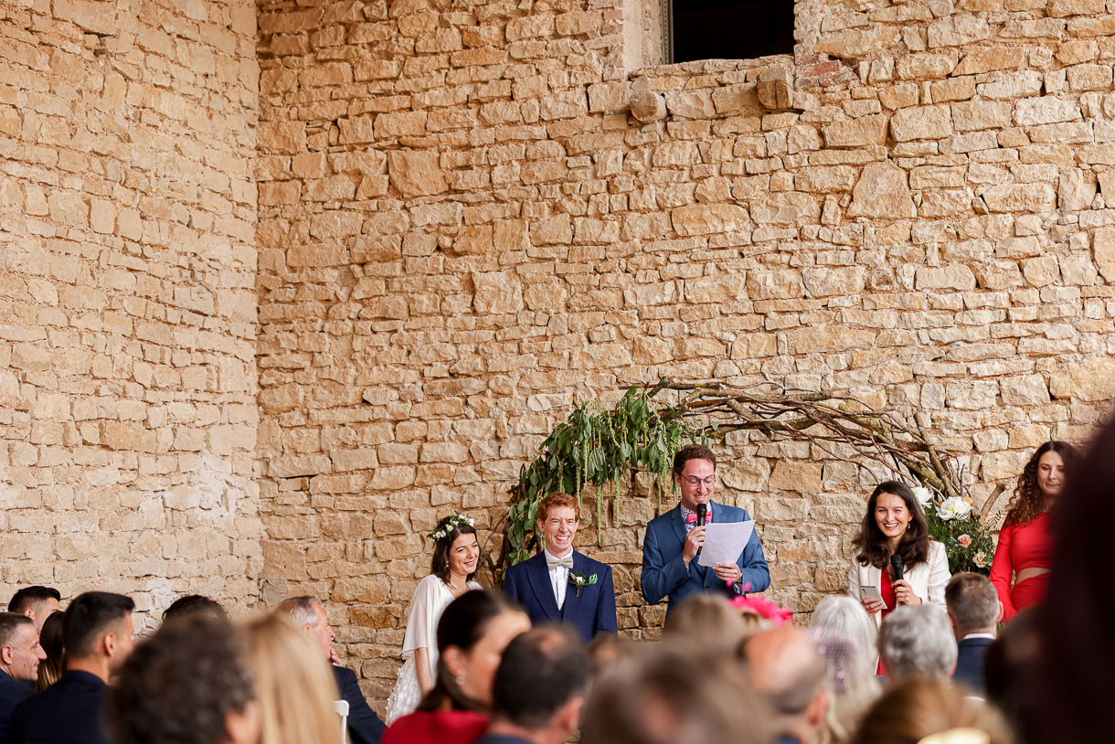 La cérémonie laïque s’est déroulée en extérieur, au cœur de la nature, dans un cadre lumineux et apaisant. Les discours, les regards et les éclats de rire ont rythmé ce moment fort de la journée.